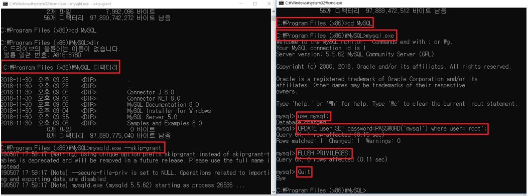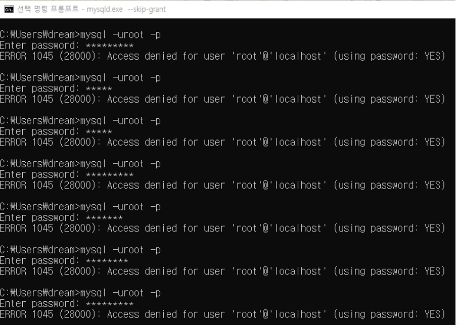 하나는 mysqld.exe –skip-grant를 입력하고 난 후 다른 커맨드 창에 아래와 같이 입력해준다.