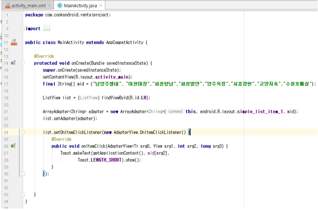 Activity_main.xml에 listview xml 추가 -> Data set 추가 -> Adapter 생성 / listView Set