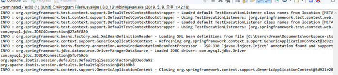 클래스 선언 아래 인스턴스 변수 sqlFactory에는 스프링이 정상적으로 동작할 경우 sqlsessionfactory를 주입시켜줄 것을 요구합니다. testSession()에서는 try – with 구문을 활용해서 실제 데이터베이스와의 연결을 담당하는 객체인 sqlsession을 생성하는 부분입니다. 위 코드의 실행 결과는 아래와 유사한 형태로 ‘org.apache/ibatis.defaults.DefaultSqlSession….’과 같은 메시지가 보여지면 정상적으로 동작하는 것 입니다.