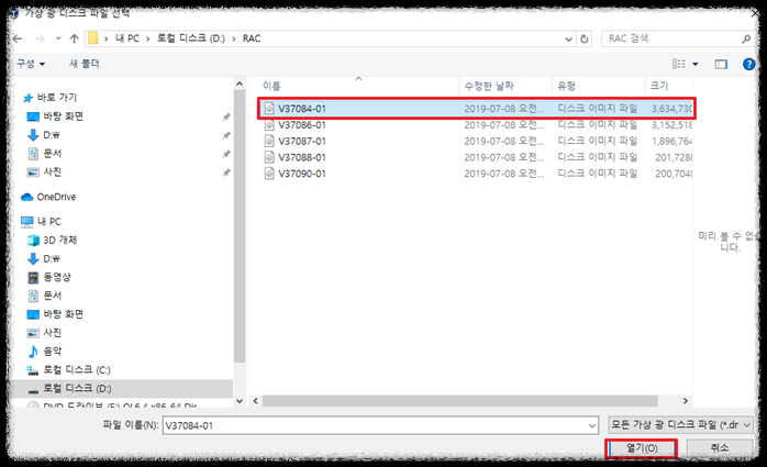 오라클 리눅스 6.4 설치 파일 중에서 “V37084-01.iso”를 선택한 후 “열기” 버튼을 클릭합니다.