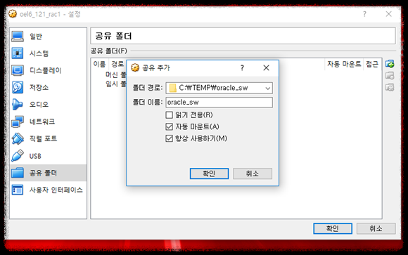공유 폴더 -> 폴더 플러스 -> 기타 -> 폴더 경로 선택 -> 읽기 전용, 자동 마운트, 항상 사용하기 확인