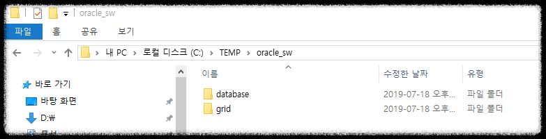 c드라이브 temp밑에 oracle_sw 폴더를 만들어 압축 푼 database와 grid를 옮겨줌.