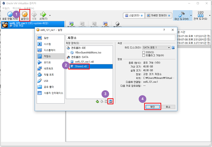 Shared.vdi 파일이 추가된 것을 확인한 후 확인 버튼을 클릭합니다.